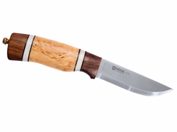 Das Helle Gürtelmesser TROFE ist ein typisch norwegisches Jagd- und Outdoormesser. Die Drop Point Klinge aus dem bewährten, rostfreien Dreilagenstahl verfügt über einen klassischen Skandischliff. Als Griffmaterialien für das ergonomisch designte Heft kommt eine schöne Kombination aus Lederscheiben, Eichenholz, Maserbirke und Hirschhorn zum Einsatz. Die gut ausgeprägte Fingermulde verhindert das Abrutschen in die scharfe Klinge. Eine passgenaue Scheide aus hochwertigem Leder rundet die Ausstattung ab.