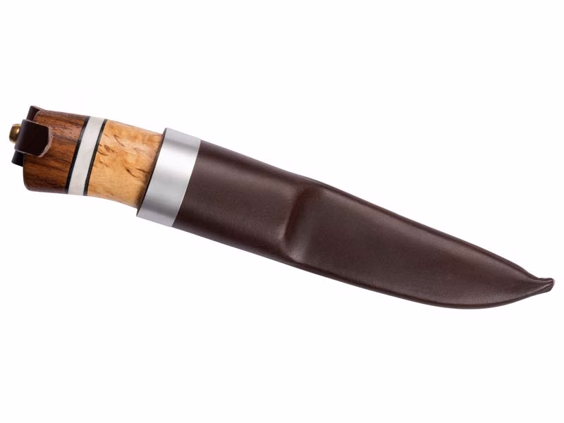 Das Helle Gürtelmesser TROFE ist ein typisch norwegisches Jagd- und Outdoormesser. Die Drop Point Klinge aus dem bewährten, rostfreien Dreilagenstahl verfügt über einen klassischen Skandischliff. Als Griffmaterialien für das ergonomisch designte Heft kommt eine schöne Kombination aus Lederscheiben, Eichenholz, Maserbirke und Hirschhorn zum Einsatz. Die gut ausgeprägte Fingermulde verhindert das Abrutschen in die scharfe Klinge. Eine passgenaue Scheide aus hochwertigem Leder rundet die Ausstattung ab.
