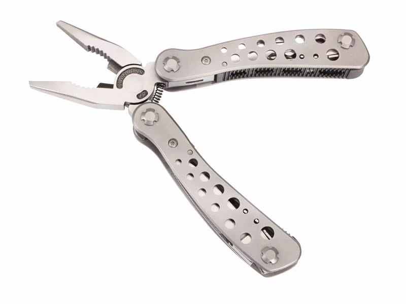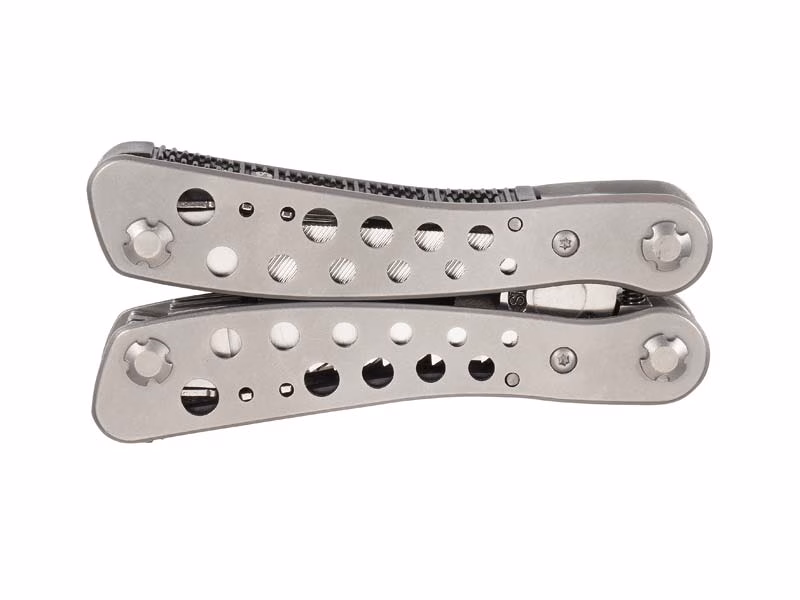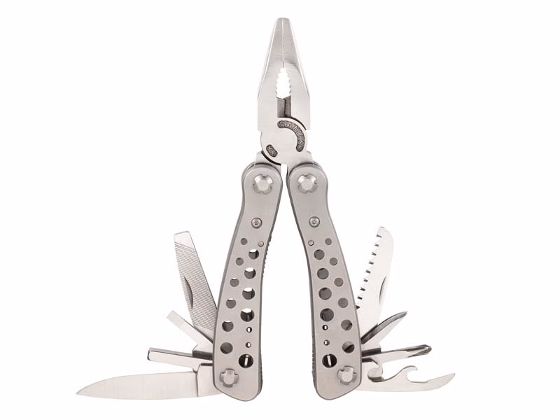 Eine breite Palette an Werkzeugen bietet dieses preiswerte Multitool aus dem Hause Herbertz. Zu dem 9-teiligen Tool gehören neben der Zange auch Klinge, Säge, Schraubendreher, Kapselheber, diverse Schraubendreher und weitere Funktionen. Alle Werkzeuge sind innen liegend und ebenso wie das matte Edelstahl-Gehäuse komplett rostfrei. Mit Bitsatz und Nylonscheide.