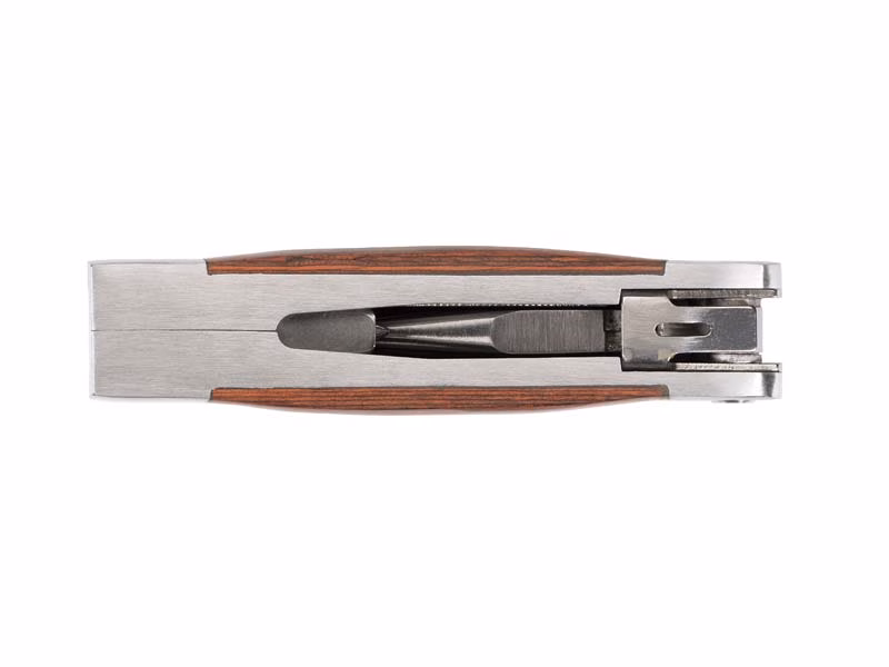 Zange, Drahtschneider, Messerklinge, Klinge mit Wellenschliff, Säge, Flaschenöffner, verschiedenartige Schraubenzieher, Feile, Adapter mit 11 Bits – und noch einiges mehr! Die Werkzeugpalette dieses Herbertz Multitools ist beeindruckend. Hinzu kommt ein attraktiver Griff mit hübschen Schalen aus Pakkaholz. Das Tool wird in einem Nylonetui mit Gürtelschlaufe geliefert.