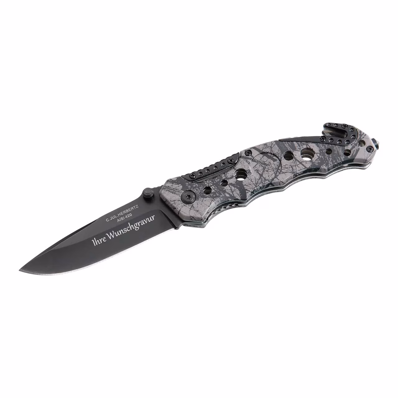 Mit einem auff?lligen Design kommt dieses Herbertz Einhand-Rettungsmesser daher. Griffschalen aus Aluminium in Camouflage-Optik setzen in Verbindung mit den zahlreichen ?ffnungen im Heft sowie den schwarzen Applikationen an der Heft-Oberseite optische Akzente. Die schwarz beschichtete Klinge aus rostfreiem AISI 420-Stahl passt sehr gut zum Griff und l?sst sich durch die beidseitig angebrachten Daumen-Pins schnell in Arbeitsposition bringen. Eine Liner-Lock Klingenarretierung, Daumenauflage an der Oberseite sowie Fingermulden an der Unterseite des Heftes sorgen f?r das sichere F?hren des Messers. Ein Gurtschneider und ein Glasbrecher am Griffende machen die Ausstattung komplett.