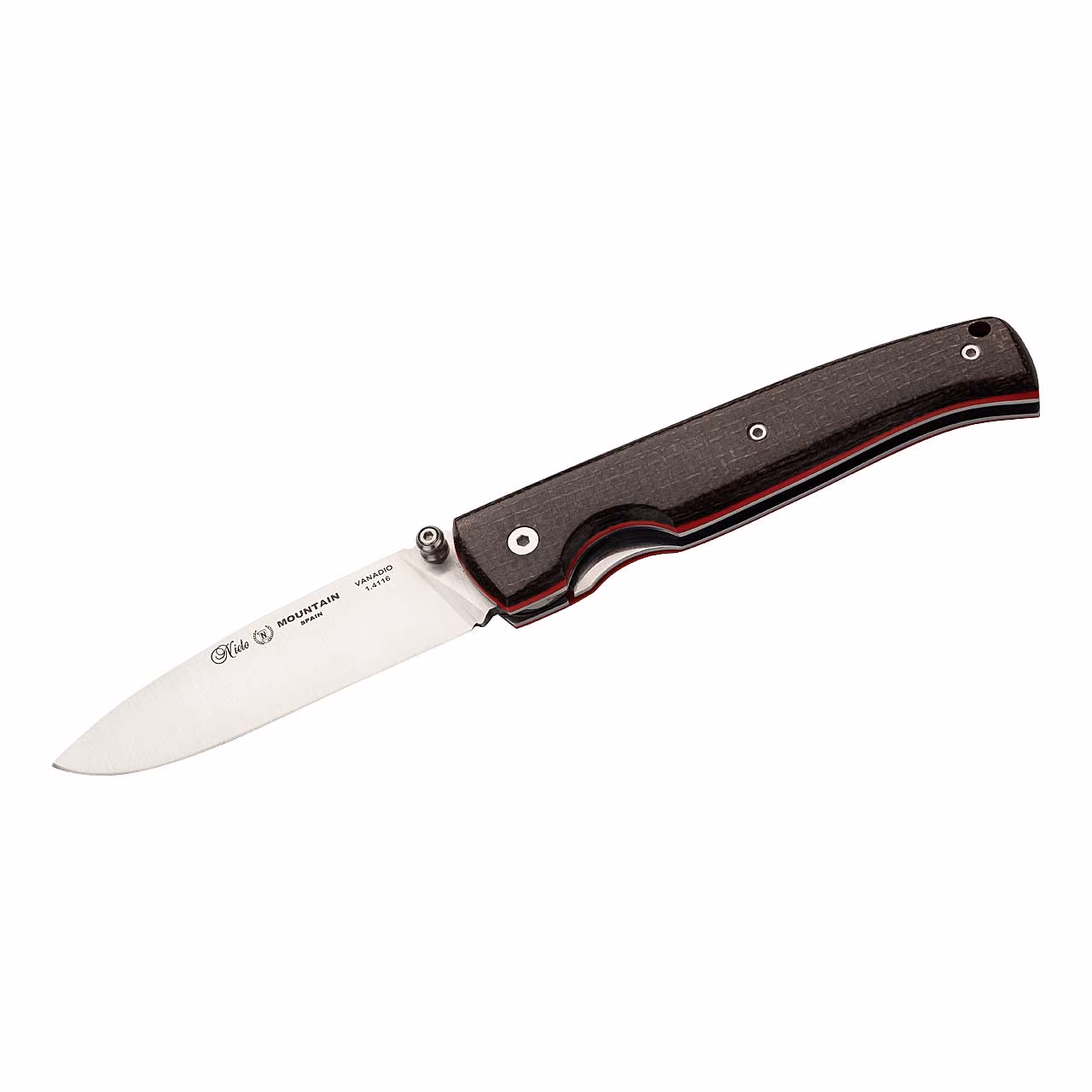 Mit der Serie MOUNTAIN präsentiert der spanische Hersteller Nieto seine ersten Einhandmesser. Beidseitige Daumenpins ermöglichen ein geschmeidiges Öffnen der Flachschliff Klinge aus rostfreiem Vanadium 1.4116 Stahl. Ein Liner Lock sorgt für die sichere Arretierung der Klinge. Die Griffkonstruktion besteht aus Edelstahlplatinen, einer Zwischenlage aus rotem Fiberglas und schön verarbeiteten Griffschalen aus Sackleinen-Micarta. Für die Montage einer Sicherungsschnur ist eine Bohrung im Griff vorhanden.
