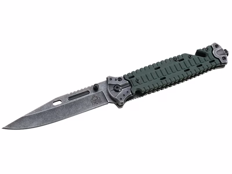 Nicht nur in Notsituationen bietet dieses Puma TEC Rettungsmesser mit Gurtschneider und Glasbrecher nützliche Dienste. Die über einen Daumenpin einhändig zu öffnende Klinge wird aus dem rostfreien AISI 420 Stahl gefertigt und von einem Liner Lock System sicher arretiert. Als Griffmaterial kommt für die Frontseite des Hefts eine grüne G10 Schale und Backen aus Edelstahl zum Einsatz, während die Rückseite samt Gürtelclip aus einem Stück Edelstahl besteht. Alle Metallteile sind im Stonewashed-Finish gehalten.