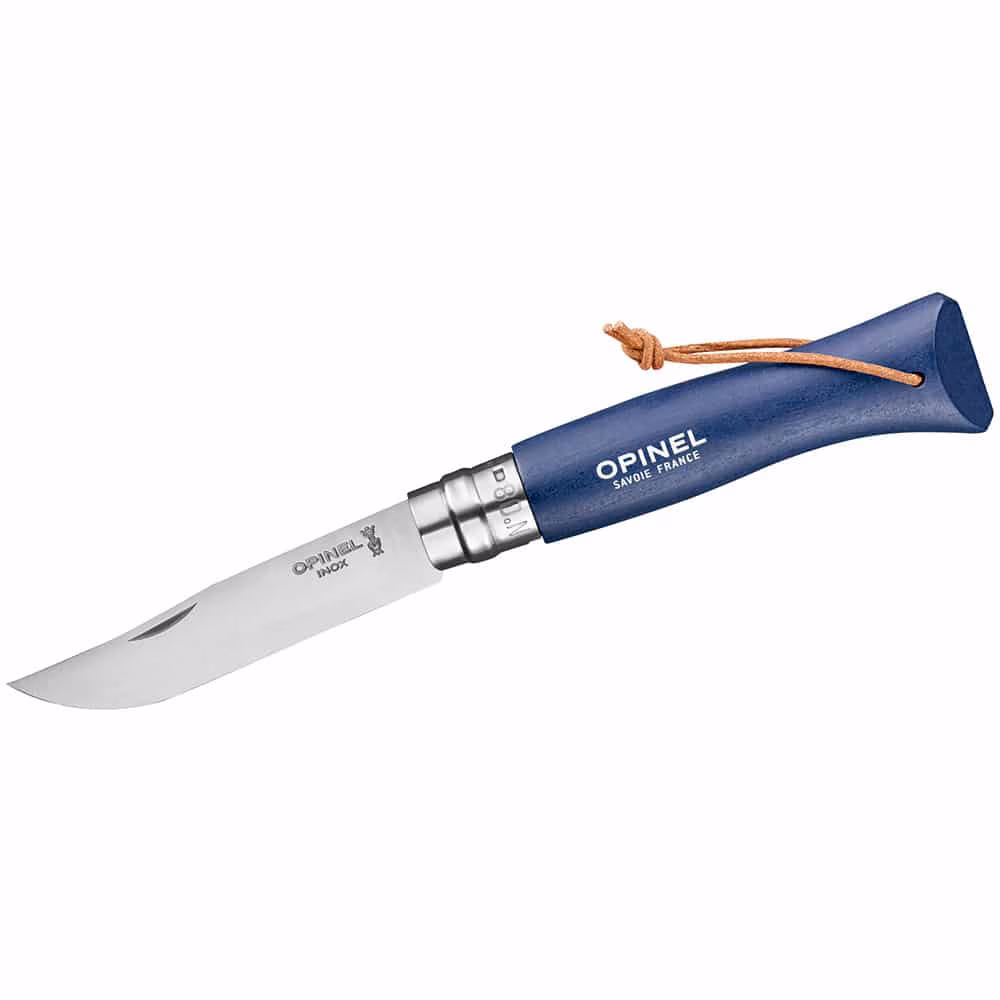 Opinel Messer Größe 08 aus der Serie 08 Colorama Earth. Als Grundlage dient ein reguläres Modell No. 08 mit rostfreier Klinge aus modifiziertem 12C27 Sandvik Stahl. Das Virobloc System sichert die Klinge vor ungewolltem Öffnen und Einklappen bei der Arbeit. Zum Befestigen an Gürtel, Schlüsselbund oder auch einem Karabiner ist am Griff aus Buchenholz eine Lederkordel angebracht.
