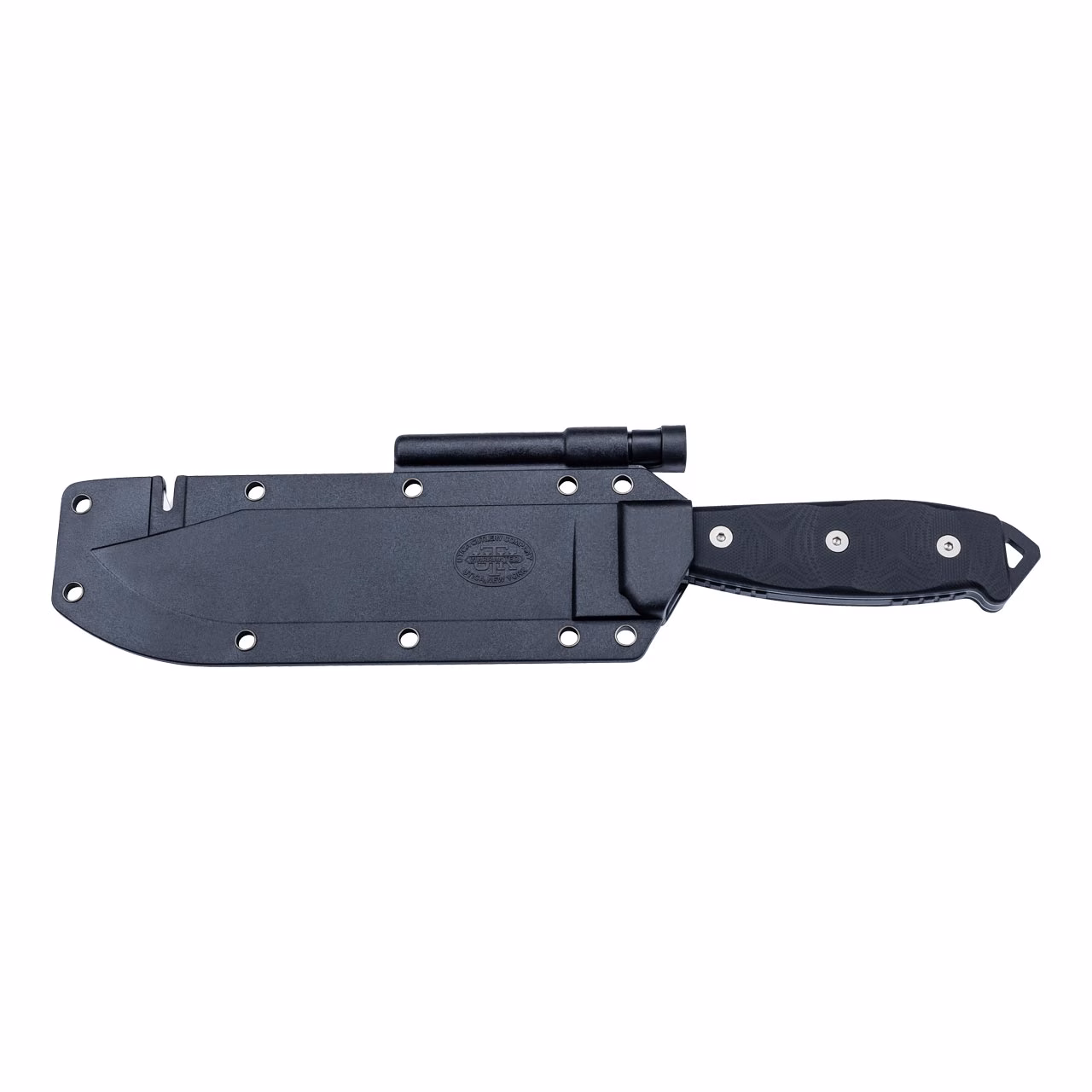 Aus der Survival Serie des US-amerikanischen Herstellers Utica stammt das robuste Allroundmesser UTK-B6. Die modifizierte Bowieklingenform in Full Tang Bauweise wird aus nicht-rostfreiem 1095 Carbonstahl hergestellt. Der extrem widerstandsfähige Stahl verfügt als Korrosionsschutz über eine reflektionsarme, schwarze Pulverbeschichtung. Schwarze Leinen-Micarta Griffschalen bilden das großzügig dimensionierte Heft, welches am Griffende mit einer Fangriemenöse ausgestattet ist. Die passgenaue, M.O.L.L.E. kompatible Kydexscheide ist bereits mit einem integrierten Karbidschärfer sowie einem Feuerstarter ausgerüstet.